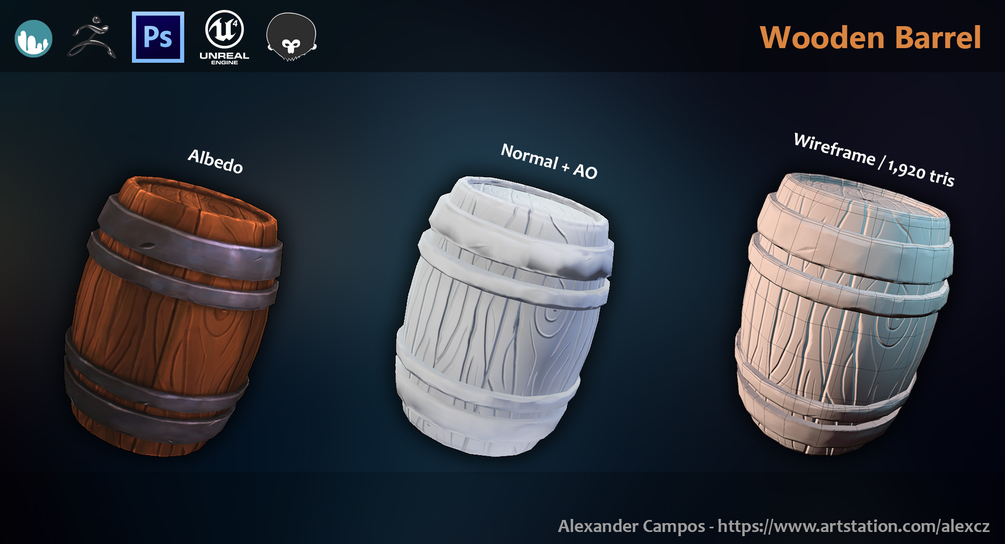 This stylized barrel prop can be fit in a fantasy world and it was made by the hand-painted technique. Ready for VR/AR, Unity, and Unreal Engine.